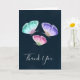 Vielen Dank Karte mit einem delikaten Naturdesign. 3 Schmetterlinge in Aquarellfarbe, rosa, lila und grün gestrichen. Dunkelblauer Aquarellhintergrund.