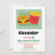 Die Einladung zum Geburtstag dieses Kindes beinhaltet einen leckeren, fröhlichen kawaii Hamburger und Pommes frites auf niedlichem grünem Hintergrund.