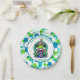 Niedlicher Frosch zum Thema personalisierte Geburtstagsfeier Teller zum Geburtstag eines Jungen. Ein bezaubernder Frosch in einem Geburtstagshut, der ein Geschenk mit einem niedlichen Polka Dot Hintergrund in Blau und Grün hält. Bearbeiten Sie den Text im personalisierbaren Bereich.