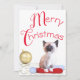 Diese weihnachtliche Weihnachtskarte enthält ein zauberhaftes siamesisches Kätzchen, das auf dem Hut des Weihnachtsmannes auf einem Tisch mit goldenen Sternen stehend ist, und ein goldenes Ornament. Die rote "frohe Weihnachtstypografie" steht über dem Design. Personalisieren Sie die rückseitigen Grüße in den Textfeldern, entfernen Sie entweder den Vorlagentext oder alle Vorlagen, um Platz für einen handschriftlichen Hinweis verlassen, oder klicken Sie auf Anpassen, um einen Schriftart auszuwählen, den Stil, die Größe und die Farbe, die Sie möchten.