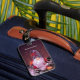 Genießen Sie dieses niedliche fröhliche Weihnachtsfest, das sich in einem kleinen Kofferraum befindet, während Ihres nächsten Urlaubs. Rot grünes graues Weihnachtsbaumdesign. Passen Sie Ihre Typografie an. Bildrecht Marg Seregelyi Fotografie.