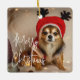 Diese niedliche, maßgeschneiderte Feriendekoration zeichnet sich durch ein reizvolles und stimmungsvolles, festliches Design aus. Ein Musterfoto eines lustigen kleinen Hundes mit einem Weihnachtshut bedeckt den Hintergrund und Sie können das Ornament personalisieren, um ein Foto Ihres eigenen Hauses oder ein anderes individuelles Bild einzufügen. Der Satz "Frohe Weihnachten" wird in einem eleganten Script-Schriftart in der verlassen unteren Ecke gedruckt.