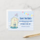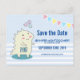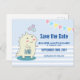 Ein Postkarten-Party Save the Date mit einem niedlich lächelnden Dinosaurier mit RAWR auf seinem Bauch geschrieben. 3 glückliche Sterne über seinem Kopf. Set auf einem hellblauen und weißen Polka-Punkte oben und Streifen unten. Die farbenfrohe Bannerdarstellung erstreckt sich über den oberen Bereich.