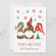 Niedliche personalisierte Urlaubskarte mit drei skandinavischen Gnomen mit saisonalen roten und grünen Hüten und Tuniken unter den Schneeflocken Rot, Grün und Gold. Personalisieren Sie den "Fröhlichen Weihnachten" Gruß (z.B. "Happy Holidays") in lustiger roter Typografie und Ihren Namen unten.