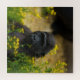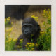Ein niedlicher kleiner Gorilla, der auf einem Gelbblumenfeld sitzt. Seine prächtigen Augen, die auf dich schauen.