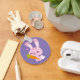 Ein niedliches, rosafarbenes Hasen hält glücklich sein Lieblingsgemüse, eine Karotte. Ein kleines rosa Liebe Herz schwimmt über dem Hasen. Der Hase sitzt an einer schlichten lila Kulisse.