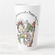 Leicht anpassbare latte Tasse, fügen Sie einfach Ihre eigene Urlaubsbotschaft hinzu! Vintage Illustration Cartoon Weihnachtsfeiergestaltung mit einem spielerischen Happy Elf Tanz. Er trägt lustige Kleidung mit einem Hut und hat spitze Ohren.