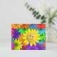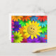 Eine hübsche und niedliche Blume mit Happy-Gesicht, die sich auf einem Bett mit hellen neonfarbenen Blume ruht. Farbenfroh und fröhlich.