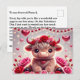 Senden Sie ein Lächeln mit unserer "Niedlichen Hearts Highland Cow Valentines Holiday Postcard". Mit einer bezaubernden Highland Kuh, umgeben von spielerischen Herzdesigns, ist diese Postkarte ideal, um Ihre Liebe auf lustige und skurrile Weise zu teilen. Ideal für diejenigen, die eine Mischung aus rustikalem Charme und Kultur schätzen, bietet diese Postkarte einen einzigartigen und herzlichen Weg, sich mit den Lieben dieses Valentinstag zu verbinden. Ob für einen Partner, einen Freund oder ein Familienmitglied, es ist eine wunderbare Möglichkeit, Zuneigung auszudrücken und Ihren Urlaub unvergesslich zu machen.