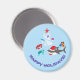Magnet mit niedlichen Ozean Weihnachtsdesign. Das Design besteht aus einem niedlichen Hai, der eine Weihnachtsmannmütze trägt und Weihnachtsgeschenke trägt, niedliche grüne Meeresschildkröte und niedliche rote Krabbe. Die Einrichtung wird durch eine kleine, weiße Koralle ergänzt, die als Weihnachtsbaum angelegt ist und mit blauen, rosa und lila Muscheln und rotem Seestern geschmückt ist. Im Text steht "Gute Ferien!". Das Design ist anpassbar und Sie können den Text personalisieren.