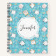 Spirale Notizbuch mit niedlichem Katzenmuster, Set auf blauem Hintergrund und dekoriert mit Regenbogen, Pfotenabzügen und mehr.