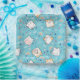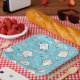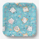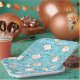 Papier Teller mit niedlichem Katzenmuster, Set auf blauem Hintergrund, mit Regenbogen, Pfotenabzügen und vielem mehr.