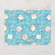 Eine Postkarte mit niedlichem Katzenmuster, Set auf blauem Hintergrund und dekoriert mit Regenbogen, Pfotenabzügen und vielem mehr.