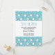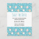 Save the Date Postkarte mit einem niedlichen Katzenmuster, Set auf blauem Hintergrund und dekoriert mit Regenbogen, Pfotenabzügen und vielem mehr.