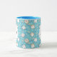 Eine Tasse mit einem niedlichen Katzenmuster, Set auf blauem Hintergrund und dekoriert mit Regenbogen, Pfotenabzügen und vielem mehr.