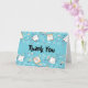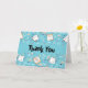 Vielen Dank Karte mit einem niedlichen Katzenmuster, Set auf blauem Hintergrund und dekoriert mit Regenbögen und Pfotenabzügen und mehr.