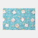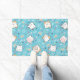 Door-Matte mit niedlichem Katzenmuster, Set auf blauem Hintergrund und dekoriert mit Regenbogen, Pfotenabzügen und vielem mehr.