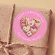Dieser Valentinstag-Aufkleber ist ein charmantes Fest der Liebe, perfekt um Ihre herzlichen Botschaften zu personalisieren. Der Aufkleber ist rund und Set vor einem weichen rosa Hintergrund, was einen warmen und einladenden Look schafft. Im Zentrum steht ein gebackenes Herz, das aus raffiniert gestalteten süßen Leckereien wie Keksen und Bonbons besteht. Jede Leckerei ist mit hübschen Details wie Vereisung, Sprinklen und Schokoladentrizzles geschmückt, die dem Design eine Touch von Laune verleihen. Das Herz umfasst auch Elemente, die Erdbeeren ähneln, was zur Vielfalt und visuellen Attraktivität beiträgt. Über dem Herzen zeigt die elegante, weiße Schrift den Zauber von "HAPPY VALENTINE’S DAY", während unten der Satz die individuell anpassbare Art des Aufklebers anzeigt.
