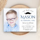 Erleben Sie Ihre Gäste mit dieser modernen Party Einladung aus dem 1. Jahrhundert mit einem niedlichen Schnurrbart mit moderner Typografie vor weißem Hintergrund. Fügen Sie einfach Ihre Veranstaltungsdetails zu dieser benutzerfreundlichen Vorlage hinzu und schmücken Sie diese Karte mit dem bevorzugten Foto Ihres Kindes, um sie zu einer einmaligen Einladung zu machen. Dreh die Karte auf, um ein blau-weißes Streifen-Muster auf der Kartenrückseite zu erkennen.