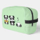 Drei hübsche kleine Pandas nebeneinander. Ein glücklicher Panda trägt ein T-Shirt mit "I heart panda" auf ihm geschrieben. Ein anderer bietet einen grünen Bambusstock an, um einen dritten Panda zu sehen, der eingeschlafen ist.