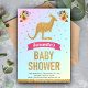 Erleben Sie Ihren Gast mit dieser wunderschönen Känguru-Thema Babydusche mit moderner Typografie auf pastellfarbenem Regenbogengradienten. Fügen Sie einfach Ihre Veranstaltungsdetails zu dieser einfach zu bedienenden Vorlage hinzu, um sie zu einer einmaligen Einladung zu machen. Dreh die Karte um, um ein goldenes Glitzer-Streifen-Muster auf der Kartenrückseite zu zeigen.