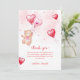 Bewundern Sie die valentinische Babydusche mit niedlichem, modernem und elegantem Jugendstil-Thema, das valentinische Babyduschthema, unser Kollektionsdesign mit elegantem Drehbuch-Schriftart "Ein kleines Liebeslied ist unterwegs", Aquarellbär mit Rosa- und Rotherherzenballon. Sie können Ihren eigenen Text über den Button "Personalisieren Sie diese Vorlage" anpassen.