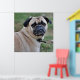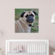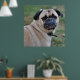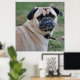 A fotograph of an liebenswürdiger pug staring at the camera with a piece of grass sticking out of his mouth.