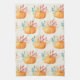 Ein Küchentuch, illustriert mit einem sich wiederholenden Muster einer Aquarellbilderin eines orangefarbenen Kürbis, der mit farbenfrohen Herbstlauben und Krawatten geschmückt ist.