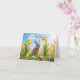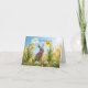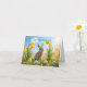 Ein niedliches, braunes Osterhasen mit weißem Bogen auf dem Kopf sitzt im Gras und duftende Ostereier verstreut an einem sonnigen Frühlingstag um sie herum.
