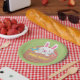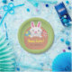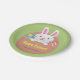 Farbenfrohe Teller für das Ostereier Party, wo ein niedliches, weißes Hasen aus dem Korb der Ostereier auftaucht, ein blaues Ei mit gelben Sternen und ein rotes Ei mit Zickzack und Punktmuster. Fügen Sie Ihre Ostermeldung in den dafür vorgesehenen Korb ein.
