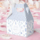 Eleganter böhmischer Osterfeder Babydusche Süßigkeiten Geschenkbox mit hellblauem Osterkaninenhasen umgeben von Frühlingskranz und blumengeschmückten Blume mit Karotten dazwischen.
