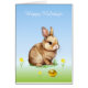 Niedlich Osterhase mit goldenem Ei und Blume Happy Holidays Card. Text kann zu Ostern oder zum Geburtstag personalisiert werden. Bunnies symbolisiert Langlebigkeit, Überfluss und Glück.
