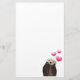 Stationery mit einem Bild eines niedlichen Otters mit nach oben schwebenden Herzen. Die Herzen sind rosa und chubby mit einem glänzenden Spiegelbild. Dieser Otter ist mit seinen Pfoten, die unter seinem furiosen kleinen Kinn ruhen, sehr schön. Sein Fell sieht nass aus, wenn er im Wasser hängt.
