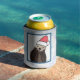 ein CAN COOLER mit einem Naturfoto eines niedlichen Otters, der sein Gesicht in seinen Pfoten hält. Tragen Sie einen roten, handgezeichnet Weihnachtsmütze. Ein Schneeflockenhintergrundmuster.