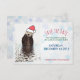 Weihnachten Save the Date Karte mit einem Naturfoto eines niedlichen Otters, der mit seinen Pfoten unter seinem Gesicht im Wasser stehend ist. Tragen Sie einen roten, handgezeichnet Weihnachtsmütze. Ein Schneeflockenhintergrundmuster hinter dem Text.