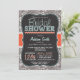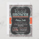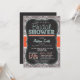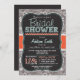 Brautduscheinladung mit niedlichem Kalkbrett Schriftart auf Orange, aquamarin grüne Farben und warmes graues Paisley Muster. Vintage Fechtkreide-Schriftart auf coolem Hintergrund mit einem rassigen Gestaltungselement.