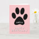 Niedlich Paw Print Pink Happy Birthday Card. Geburtstagskarte mit einem schwarzen Hundebundfoto, einem Namen und einem Happy Geburtstagstext auf einem rosa Hintergrund. Der Name befindet sich auf dem Pfotendruck - personalisieren Sie die Karte mit Ihrem Namen. Sie können auch den Text Glücklichen Geburtstag ändern.