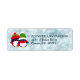 Zwei niedliche Pinguine stehen vor einem abstrakten, bokeh blauen Schneeflockhintergrund. Jeder der Pinguine ist in roten und grünen Winterschals und Hüten gekleidet. Ihr benutzerdefinierter Text ist rechts dunkelblau grau.