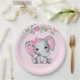 Papier Teller mit einer niedlichen rosa Elefanten Aquarellbild. Sie hat niedliche Pink-Weiß-Polka-Punkteohren und einen hübsch rosa Schleifenbogen auf ihrem Kopf. Die Decke ist mit einem schönen Rosenbukett dekoriert.