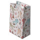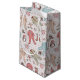 Diese niedliche Weihnachtsgeschenktasche ist mit einem handgezeichnet Muster aus Weihnachtskarosserietüten, bezaubernden Winterfüßchen (Pinguin, Rentier, Teddybär), Bikes, Flaschen, Schnullern und Weihnachtsgeschenken ausgestattet, die alle auf einem weichen rosa Hintergrund mit verstreuten niedlichen kleinen Sternen stehen.