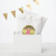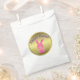 Eine bezaubernde Osterbeutel (perfekt für die Kleinen, um bei der Ostereierjagd ihre Mini-Eier zu sammeln!) mit einem süßen kleinen rosa Ostersonnigen mit einem Schal um den Hals. Oben ist der Gruß in lila, "Happy Oaster" (die sich an den Anzug anpassen lassen) und hinter ihr ist ein glänzender Goldkreis.
