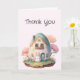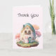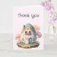 Vielen Dank Karte mit einem bezaubernden Bild mit einem runden, geformten Hasen stehend draußen ist es eiförmig Haus. Hat eine pastellfarbene japanische Kawaii-Atmosphäre.