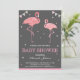 Erleben Sie die niedliche Babydusche mit ansprechenden Flamingos mit lebhaften Elementen vor grauem Hintergrund. Fügen Sie einfach Ihre Veranstaltungsdetails zu dieser einfach zu bedienenden Vorlage hinzu, um sie zu einer einmaligen Einladung zu machen. Dreh die Karte um, um ein rosa und weiße Streifen-Muster auf der Kartenrückseite zu erkennen.