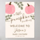 Ein niedliches fallrosa Kürbismädchen Babydusche Poster Willkommensschild. Dieses moderne Herbst-Babydusche-Begrüßungsschild besticht durch einen modernen Kalligraphie-Script-Schriftart, rosa Kürbis und grüne Eukalyptus-Äste.