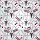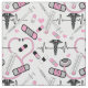 Muster mit einem herzförmigen Stethoskop, caduceus EKG, Schüsse, Thermometer, Verbände und Pillen in Rosa, Schwarz, Grau und Weiß von Holiday Hearts Designs (alle Rechte vorbehalten).