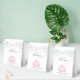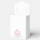 Niedliches Mädchen Duschbox mit "danke" in schlichter grauer Typografie und einem stilvollen Gastgeschenk mit Wimpern und einem rosa Kürbis Wasserfarbe.