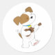 Ein niedlicher Welpe mit Schwanz wackelt, singt und tanzt, während er eine Ukulele baumelt.