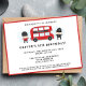 Niedliches London Themed Birthday Party Einladung mit einem roten Doppeldecker-Bus, Palastwächter und Polizisten. Zurück hat einen roten Hintergrund und hat anpassbaren Text und Alter.