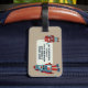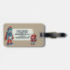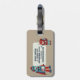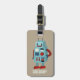 Reisen Sie mit diesem niedlichen Gepäckanhänger. Hier finden Sie Beispiele für Roboter im Retrostil in Blau- und Rottönen vor einem bräunlichen Hintergrund. Es gibt einen Punkt, an dem ein Name oder eine Initiale auf der Vorderseite und ein Punkt auf der Rückseite eingefügt werden können, um zusätzliche Kontaktdetails hinzuzufügen.