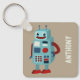 Dieser Schlüsselanhänger ist bereit, mit einem Namen oder einem anderen Text auf der Vorderseite personalisiert zu werden und zeigt Illustrationen von drei niedlichen Vintagen Robotern in blau und rot mit einem Roboter auf der Vorderseite und zwei weiteren auf der Rückseite.